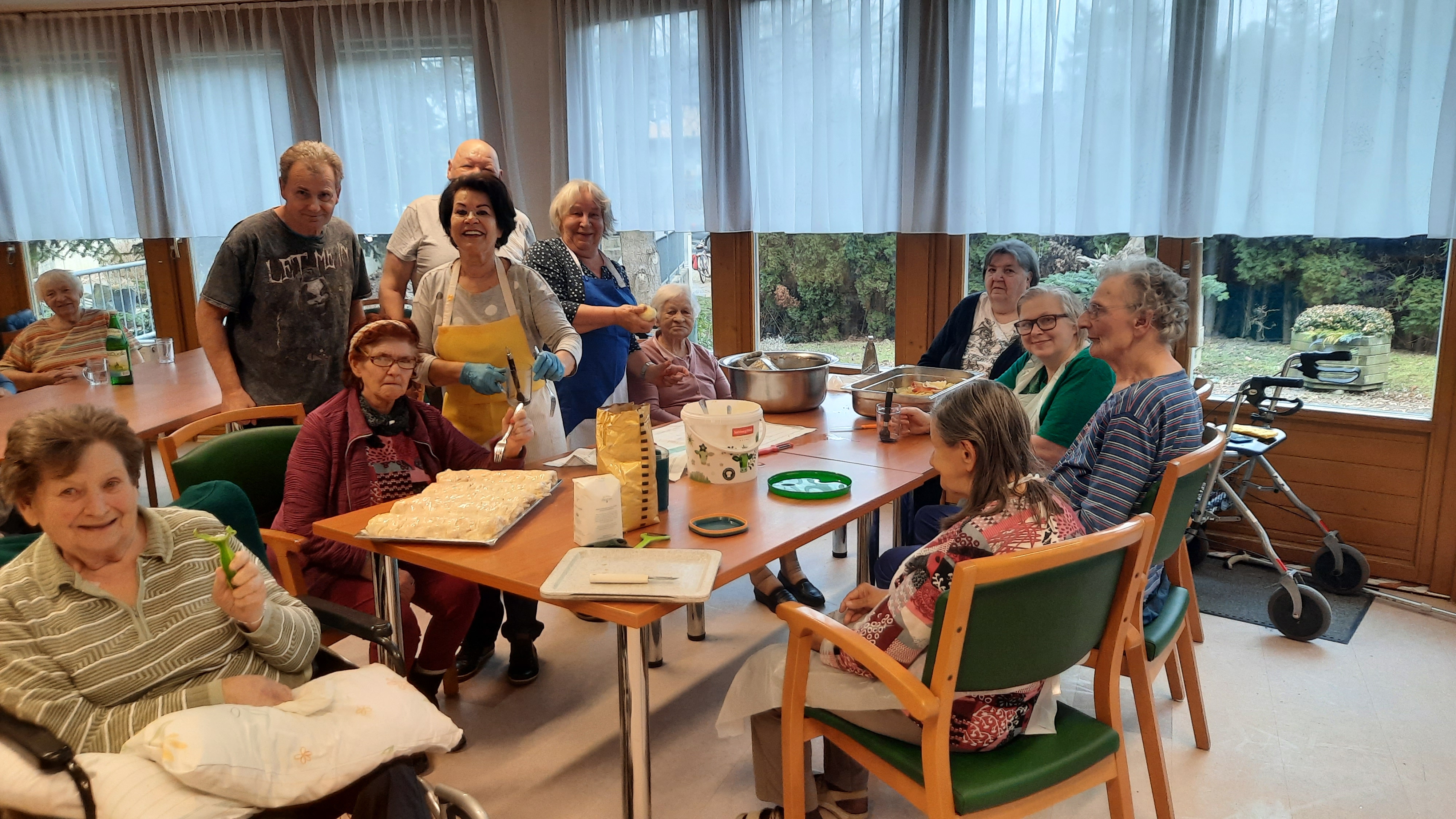 Die Bewohner:innen des SeneCura Sozialzentrums Feldbach backten kürzlich gemeinsam köstliche Apfel- sowiel Kartoffelstrudel für das Abendmenü. Eifrig schälten und schnibbelten sie gemeinsam mit den ehrenamtlichen HelferinnenFrau Schweigberger und Frau Zweifler, einige Äpfel sowie Kartoffeln. Gleichzeitig wurden Zwiebeln und Grammeln auf dem Herd angebraten und der herrliche Duft verbreitete sich schnell in den Räumen des Sozialzentrums. Dabei plauderten die Köchinnen und Köche über frühere Zeiten und alle konnten sich lebhaft daran erinnern, wie die Strudel zu Hause gemeinsam mit der Mama oder der Oma zubereitet wurden. Die Vorfreude auf das besondere Abendessen war riesengroß und so verkosteten die Bewohner:innen die leckeren Strudel.