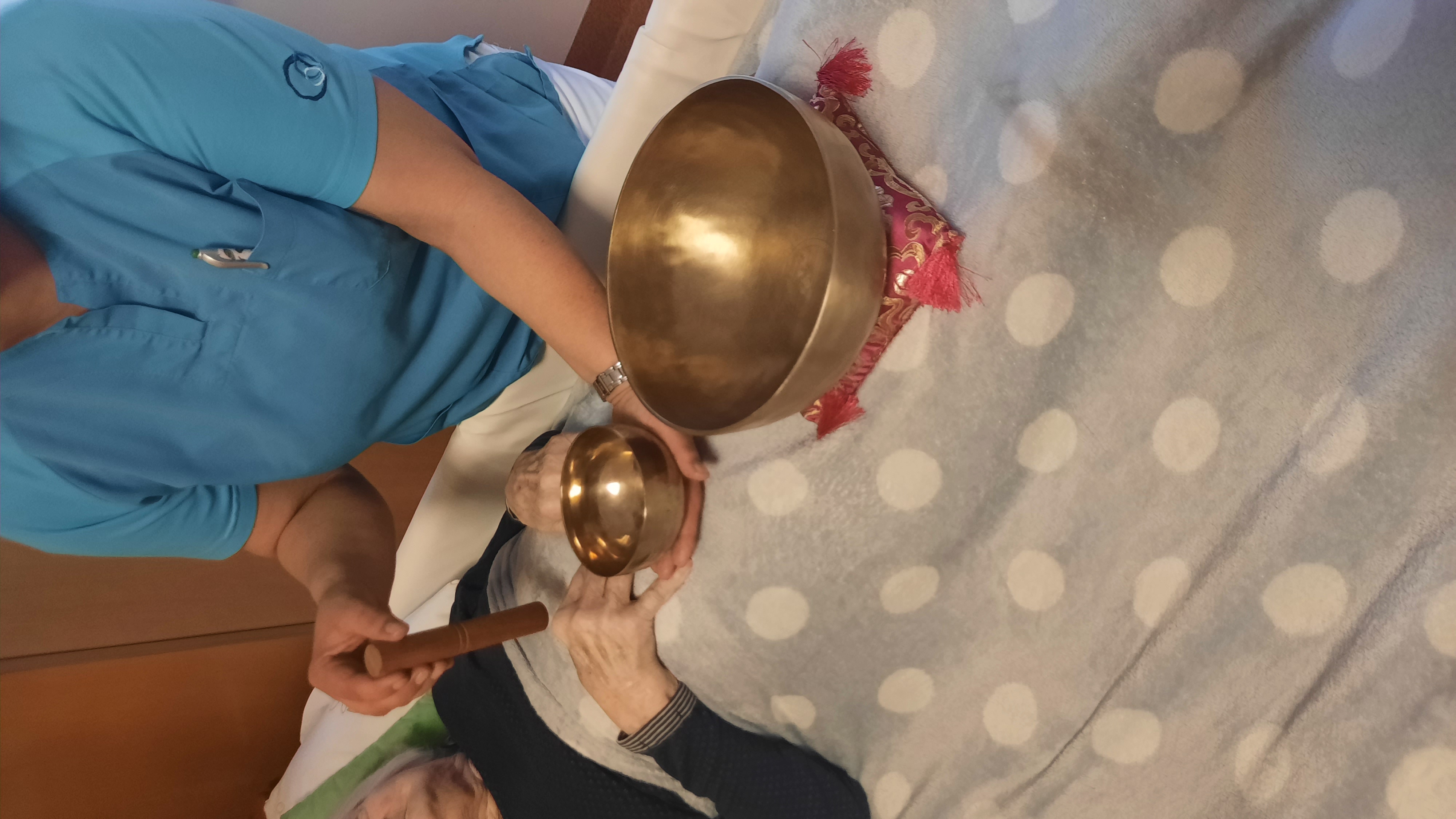 Die Pflegeassistentin des SeneCura Sozialzentrums Feldbachs, Maria Edelsbrunner, ist ausgebildete Klangschalentherapeutin und gestaltete kürzlich eine Einheit für die Bewohner:innen des Hauses. Ziel der Klangschalentherapie ist das Erreichen eines Entspannungszustands sowie eine erhöhte Konzentration. Zudem sollen emotionale Blockaden und Verspannungen durch die Therapie gelöst werden. Der Klang kann mit seiner Vibration für geistiges und emotionales Wohlbefinden sorgen.