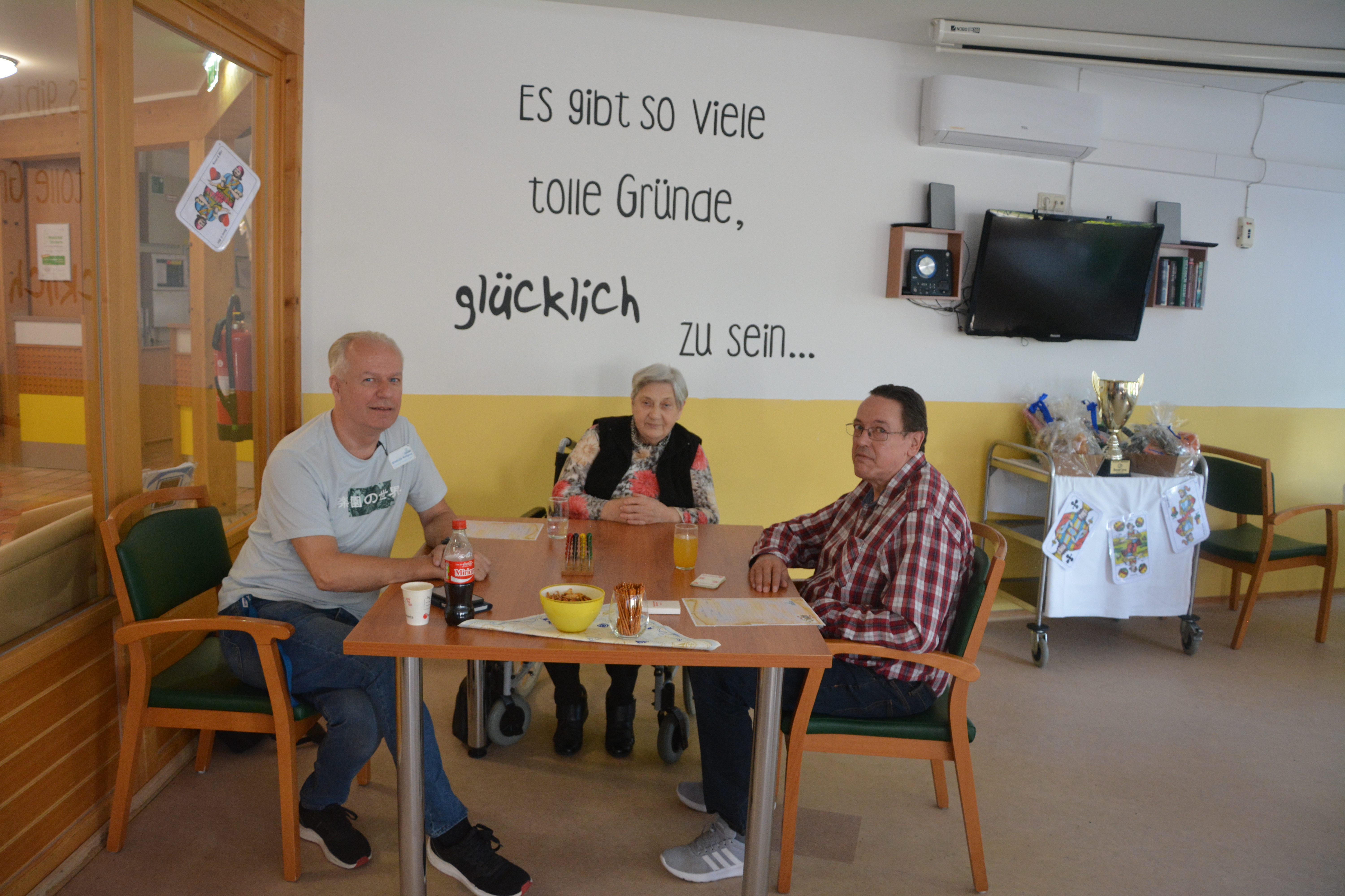 Für die richtige Turnier-Stimmung sorgten Getränke, Kaffee und Salzgebäck als Nervennahrung am Vormittag. Nach einem stärkenden Mittagessen ging es motiviert in die nächste Runde. Begleitet wurden die Spieler:innen jeweils von einer Pflege- oder Seniorenbetreuungskraft ihres Hauses.