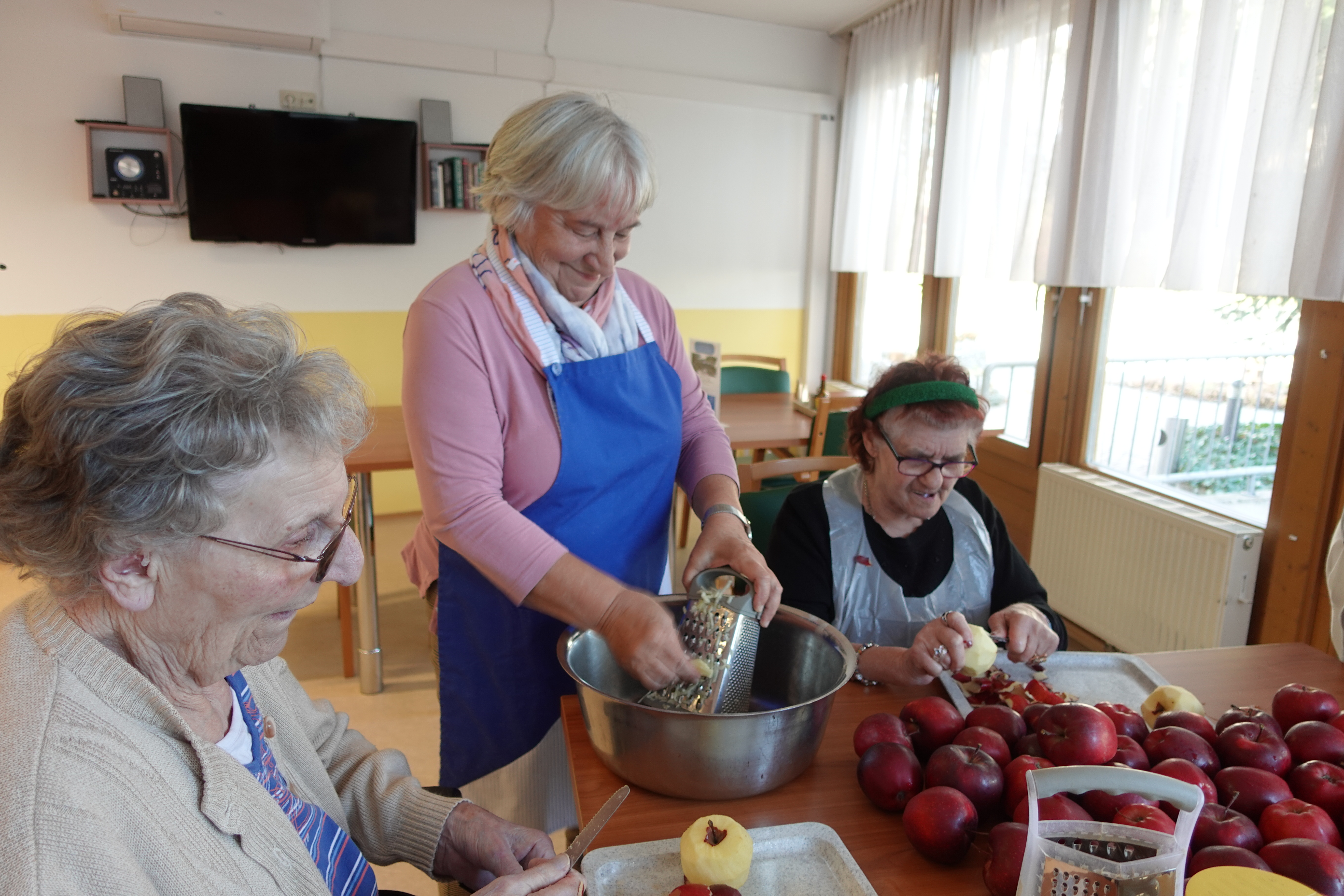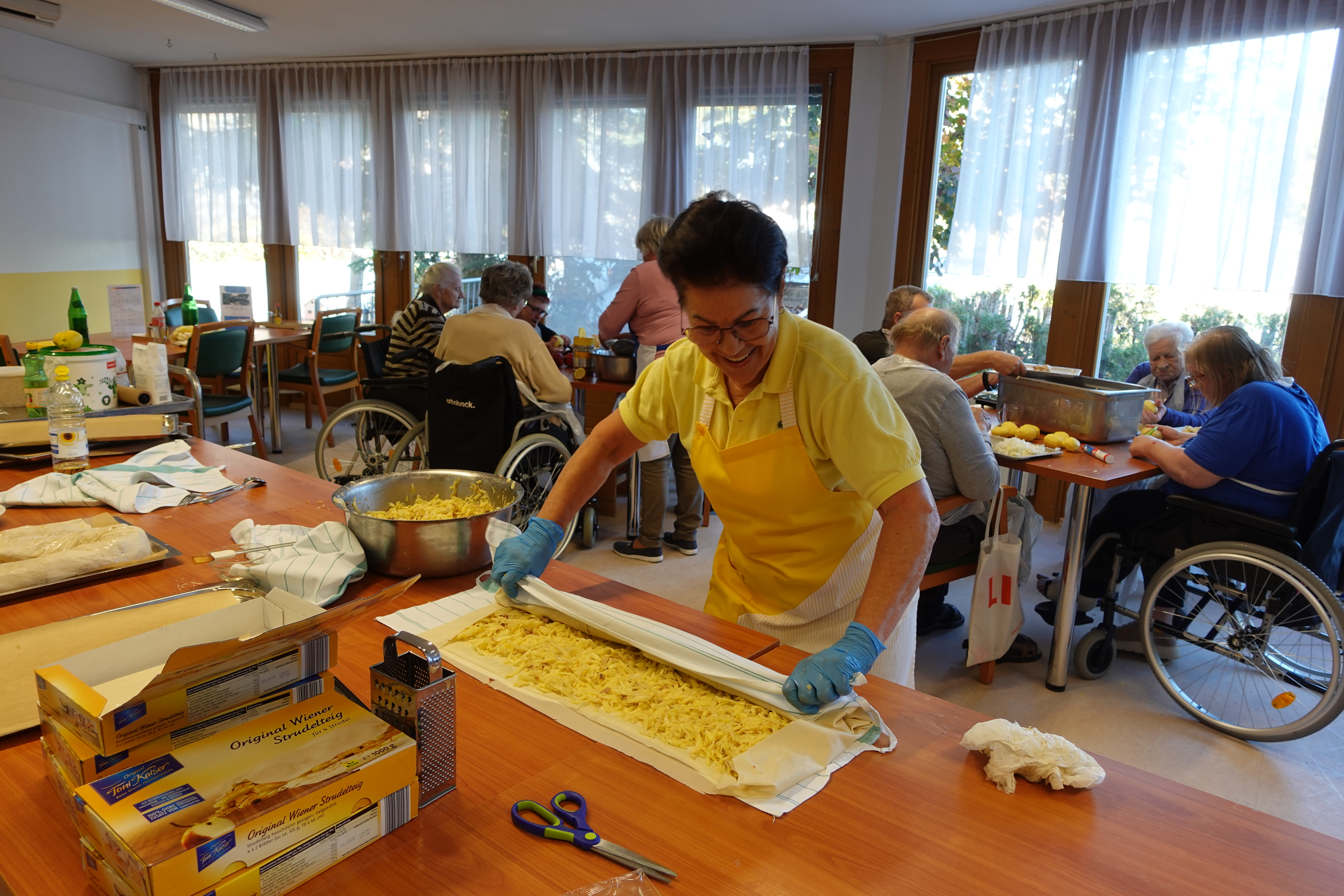 Im SeneCura Sozialzentrum Feldbach – Haus Melisse wollten die Bewohner:innen kürzlich gemeinsam Strudel backen. Eifrig wurde geschält und zerkleinert – die Seniorinnen und Senioren beschlossen, das Abendessen selbst zu machen. Es gab Apfel-, Kartoffel- und Rübenstrudel. Dabei plauderten die Bäcker:innen über frühere Zeiten und alle konnten sich lebhaft daran erinnern, wie die leckeren Strudel zu Hause gemeinsam mit der Mama oder der Oma zubereitet wurden. Verfeinert wurden die geschnittenen Äpfel mit etwas Zucker, Zimt, Vanillezucker sowie Nüssen, die danach auf dem Strudelteig verteilt wurden – die Gemüsestrudel wurden entsprechend gewürzt. Auch das Einrollen übernahmen die fleißigen Helfer:innen, wie Fr. Schweigberger und Fr. Zweifler sowie Sabine von der Seniorenanimation und zum Schluss wurden alle Strudel mit Ei bestrichen und ins Backrohr gegeben. Schon nach kurzer Zeit verbreitete sich der köstliche Duft der goldbraun gebackenen Köstlichkeiten im ganzen Haus und die Vorfreude auf das besondere Abendessen war riesengroß. Nach der Kostprobe waren sich die Bewohner:innen schnell einig, dass dies die besten Strudel seit Langem waren.