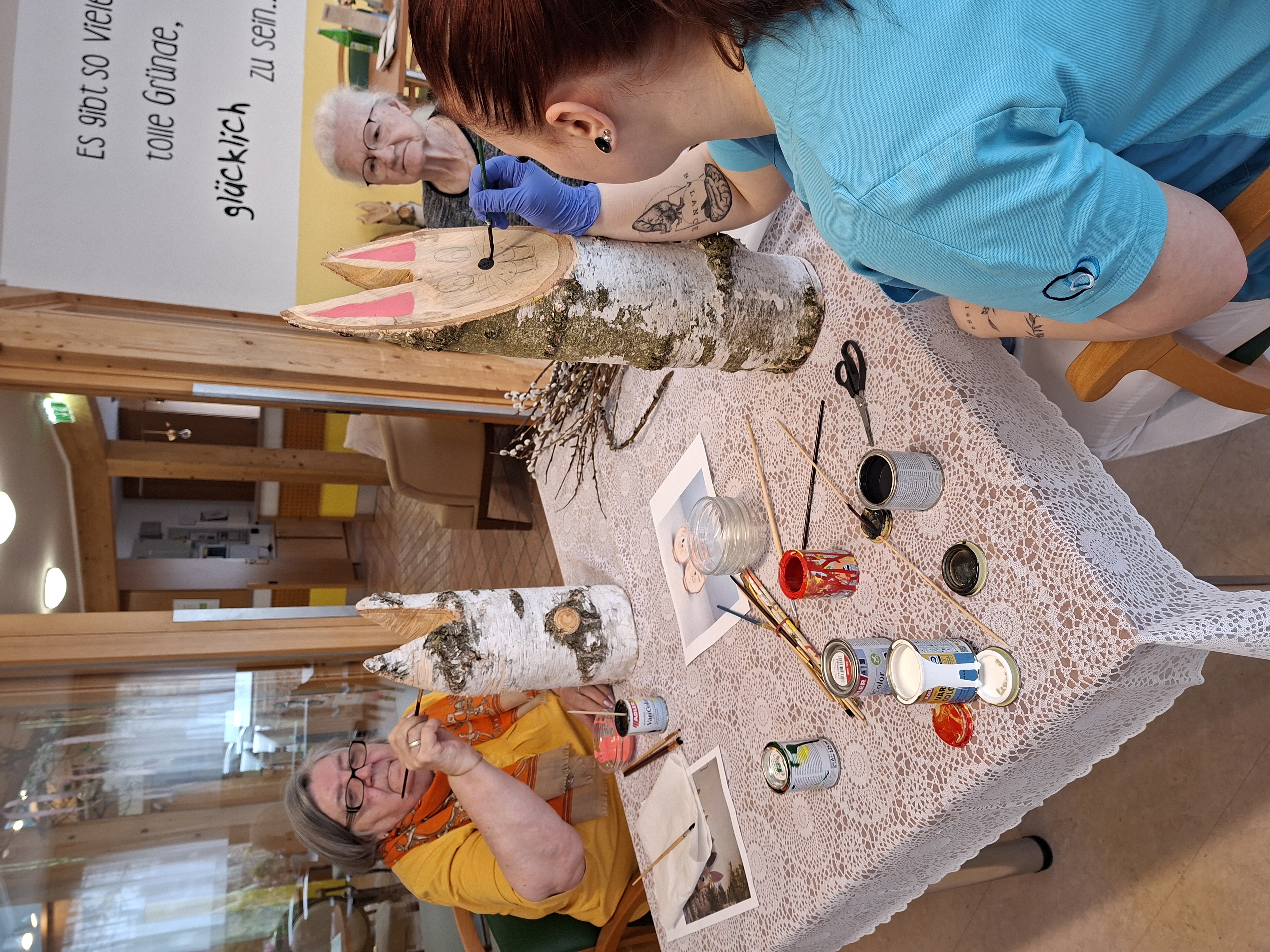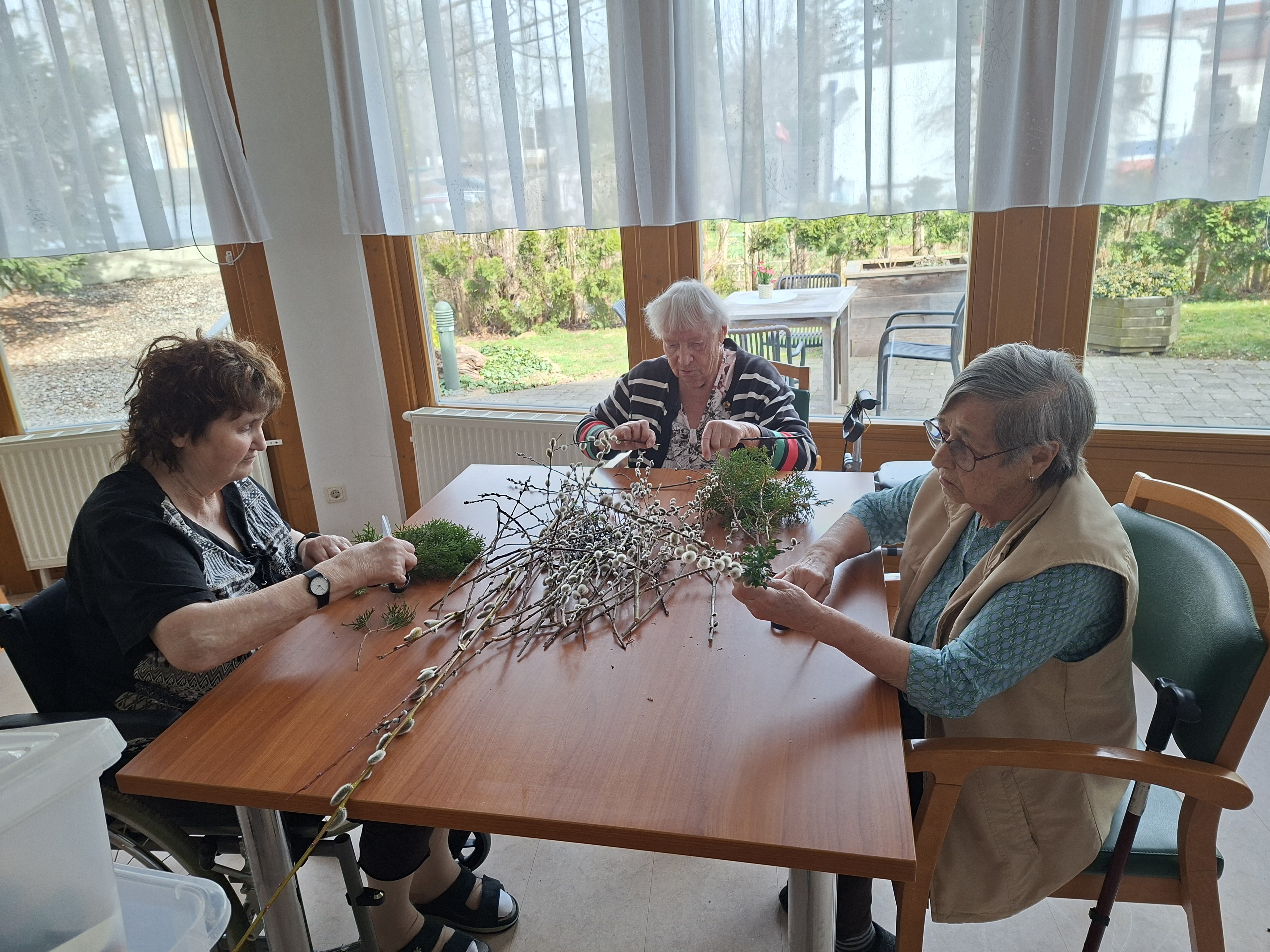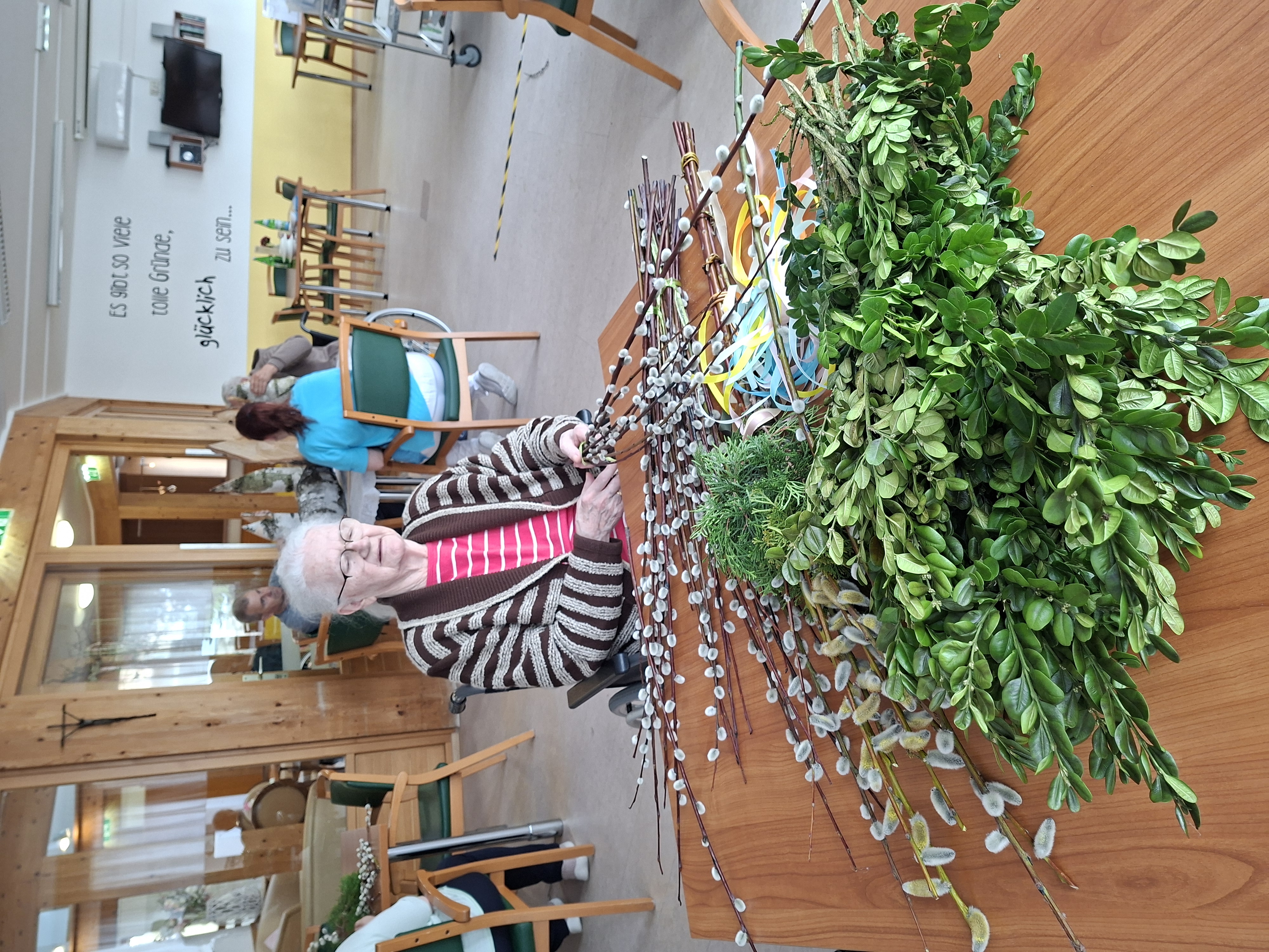 Gemeinsam mit den Bewohnerinnen und Bewohnern wurden im Vorfeld im SeneCura Sozialzentrum Feldbach Palmbuschen gebunden. In gemeinsamer Runde entstand dabei eine ruhige und besinnliche Atmosphäre, die das Miteinander stärkte und auf das Osterfest einstimmte. Auch für die österliche Dekoration wurde mit viel Engagement gearbeitet. Die Bewohnerinnen und Bewohner gestalteten Holzosterhasen, die sorgfältig abgeschliffen und anschließend liebevoll bemalt wurden. Die fertigen Dekorationen sorgen nun für eine freundliche und einladende Stimmung im Eingangsbereich des Hauses. Der Tag war geprägt von gemeinsamer Vorbereitung, Kreativität und einer angenehmen Vorfreude auf das bevorstehende Osterfest.