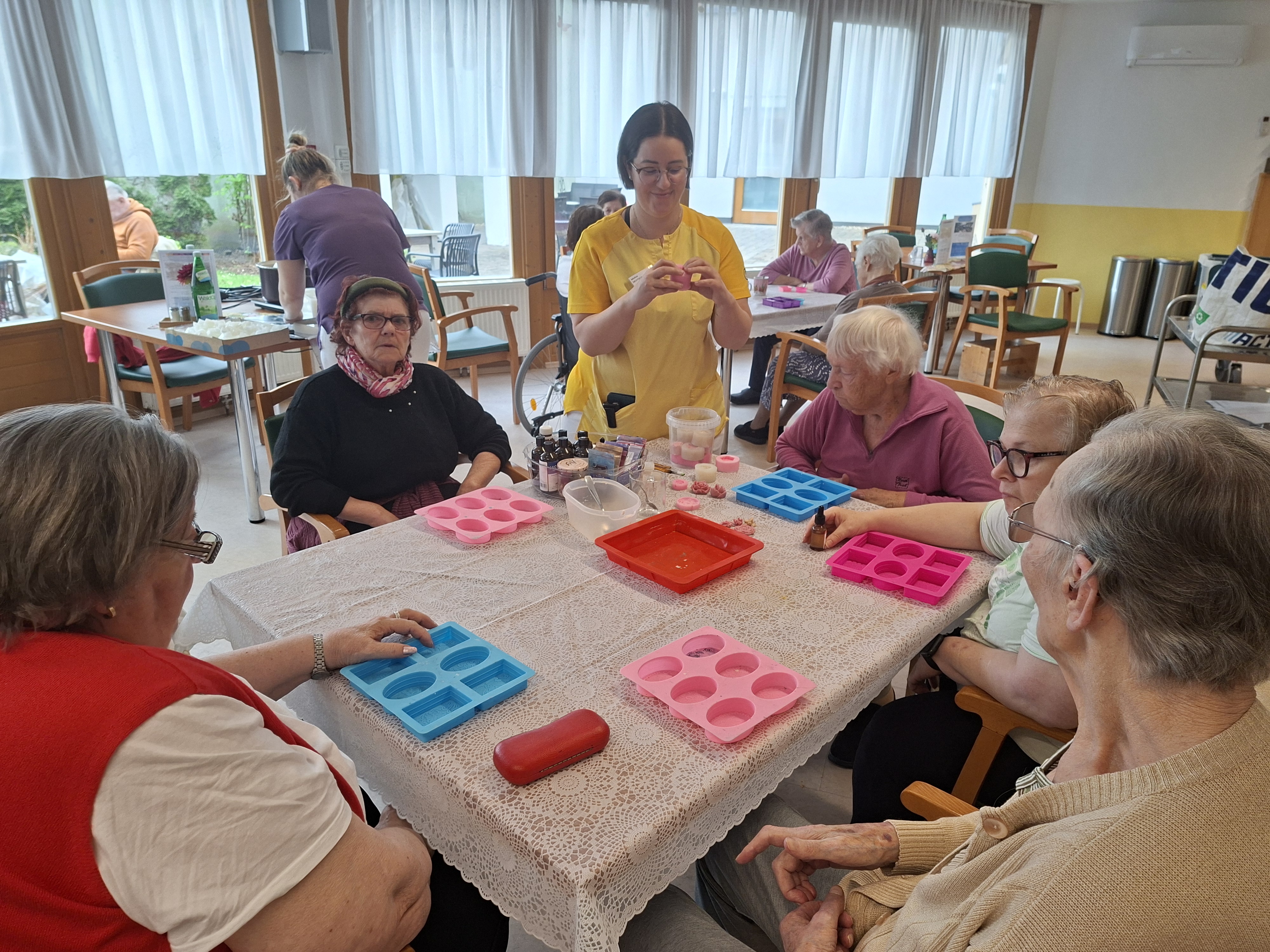 Im SeneCura Sozialzentrum Feldbach gestalteten unsere Bewohnerinnen und Bewohner heuer mit viel Freude ihre Muttertags- und Vatertagsgeschenke selbst. Dabei entstanden liebevoll hergestellte, duftende Seifen in verschiedenen Varianten. Für die Damen wurden unter anderem Düfte wie Rose, Lavendel, Kokos und Orange gewählt, während für die Herren Seifen mit Sandelholz- und Kaffeeduft gefertigt wurden. Während der Herstellung erfüllte ein angenehmer Duft den gesamten Raum und sorgte für eine besonders angenehme Atmosphäre. Die gemeinsame kreative Arbeit bereitete allen Beteiligten große Freude. Ein herzliches Dankeschön gilt Wohnbereichsleitung Frau Melisa Deutsch für die fachkundige Anleitung sowie allen Helferinnen und Helfern für die gelungene Umsetzung dieses Gemeinschaftsprojekts.